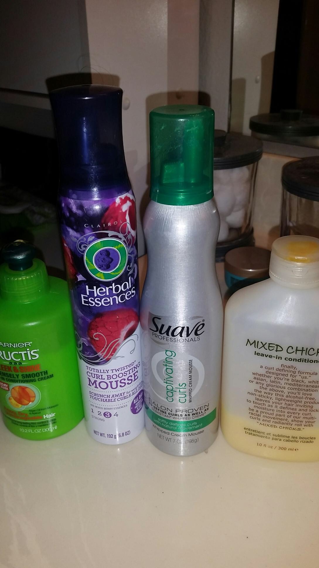 I use Herbal Essence shampoo and conditioner (the moisture rising line). Then I put a little leave-in conditioner near the base of my neck because my hair and curls tend to get tangled a lot under there. Afterwards, I put on my Herbal Essence Totally Twisted Curl Boosting Mousse (in the purple can), then I put on the Suave Captivating Curls Whipped Creme Mousse. I really like this one because it’s very thick and very creamy and it really makes my curls stay. And lastly, I use the Mixed Chicks leave in conditioner just for my baby hairs on the front of my head.