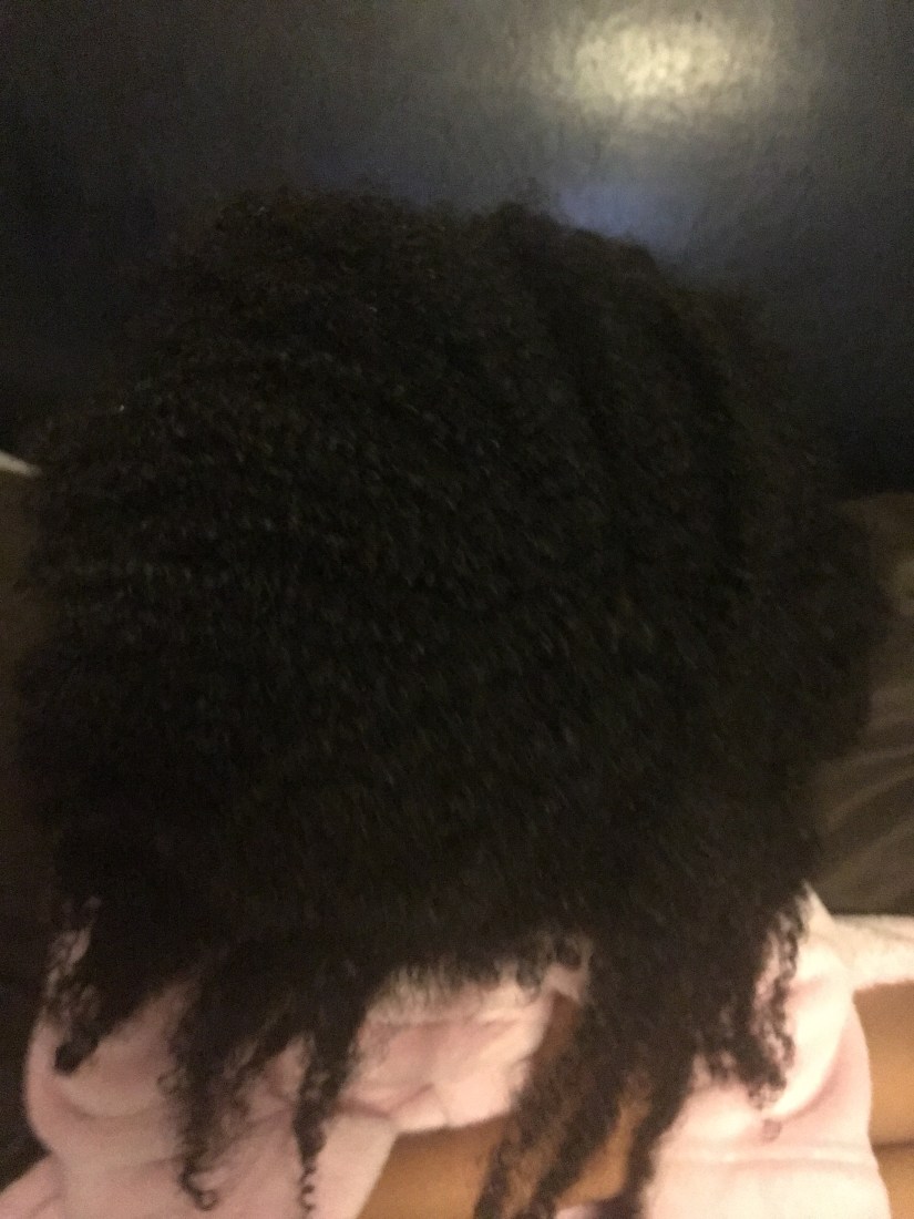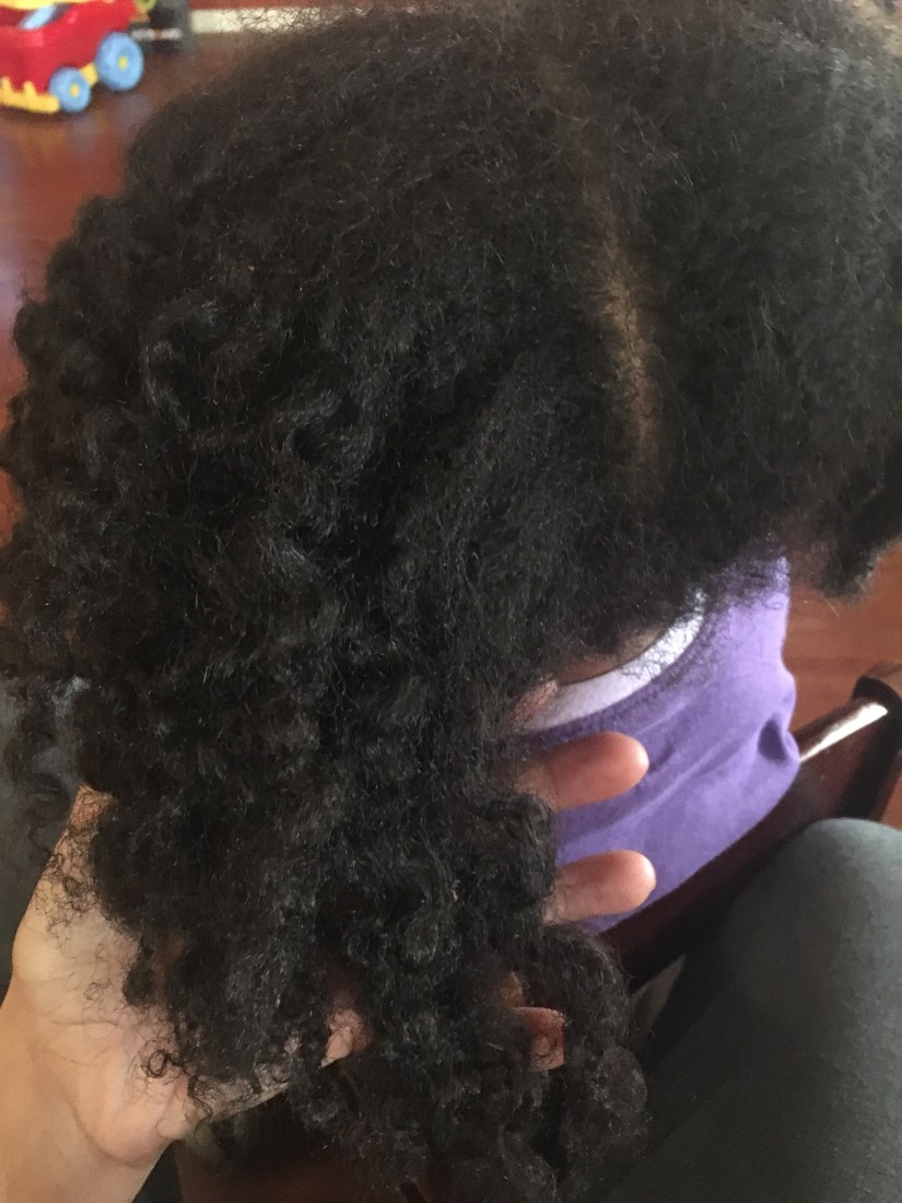 2:38 p.m. After a quasi bath/co-washing and conditioning session, it’s time to move back to the chair to towel dry with a t-shirt, stare at the beautiful curls and decide what the heck to do with it now. Should I take the easy way out by parting it down the middle and create two curly ponytail puffs? Or do I make our next detangling life way easier by parting at least four ways and braiding? I decide to go for the gold and tackle parting multiple ways with these curls. Grabbing the detangler again, Carol’s Daughter Honey Mimosa, the water spray bottle and Shea Moisture’s Kids Curling Butter Cream we go all in!
